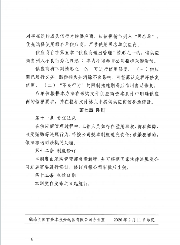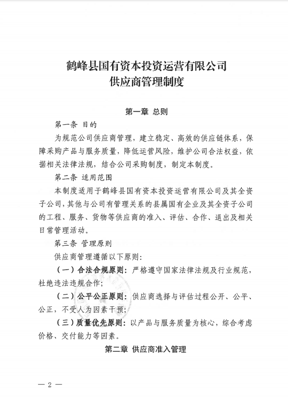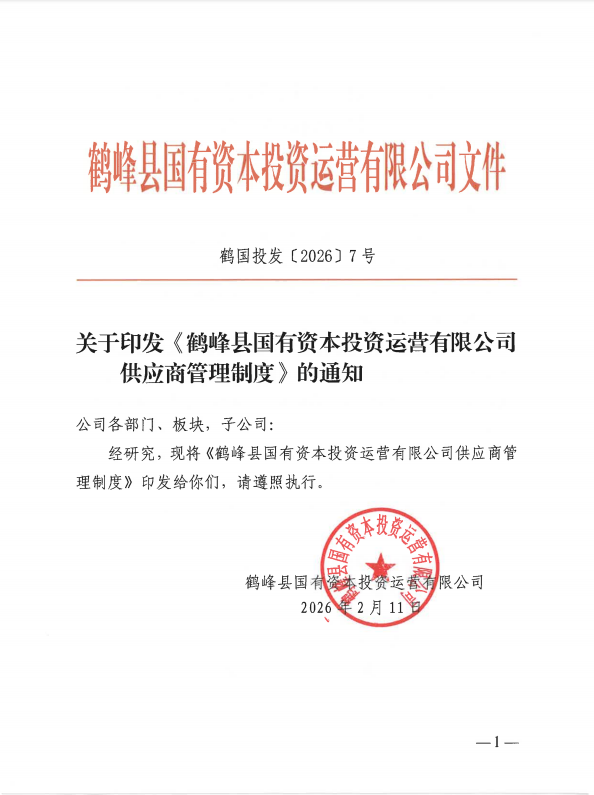关于印发《鹤峰县国有资本投资运营有限公司供应商管理制度》的通知